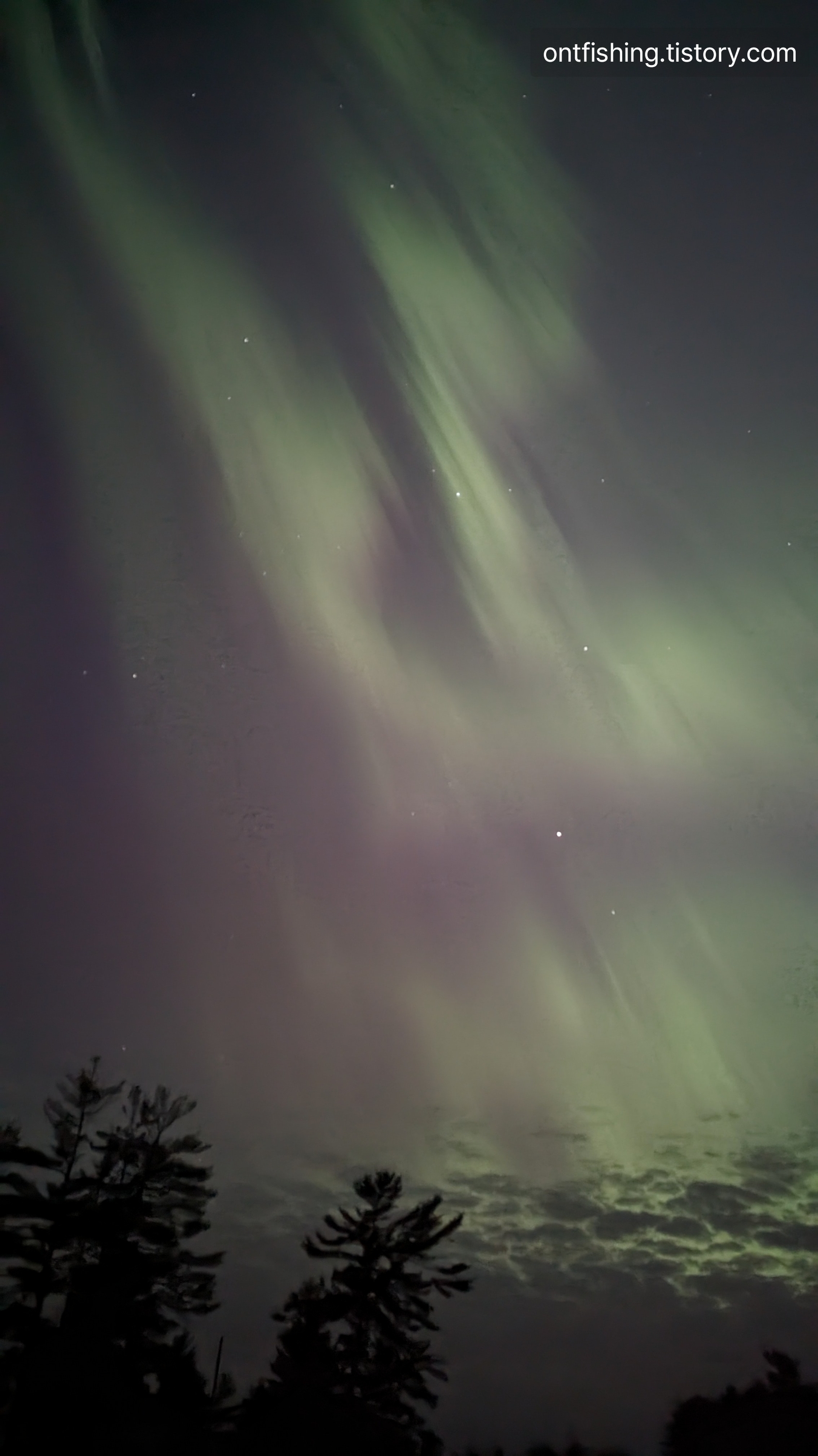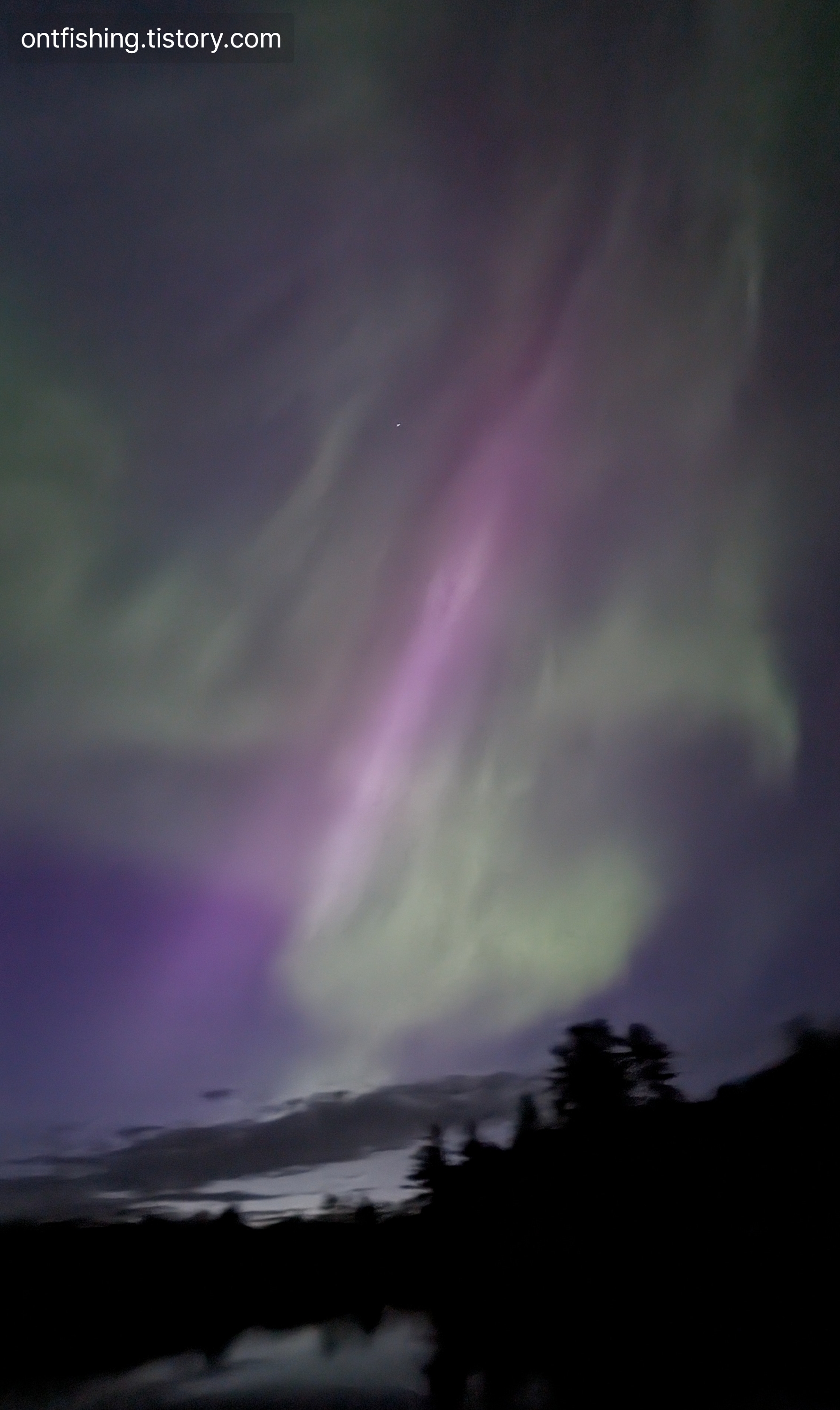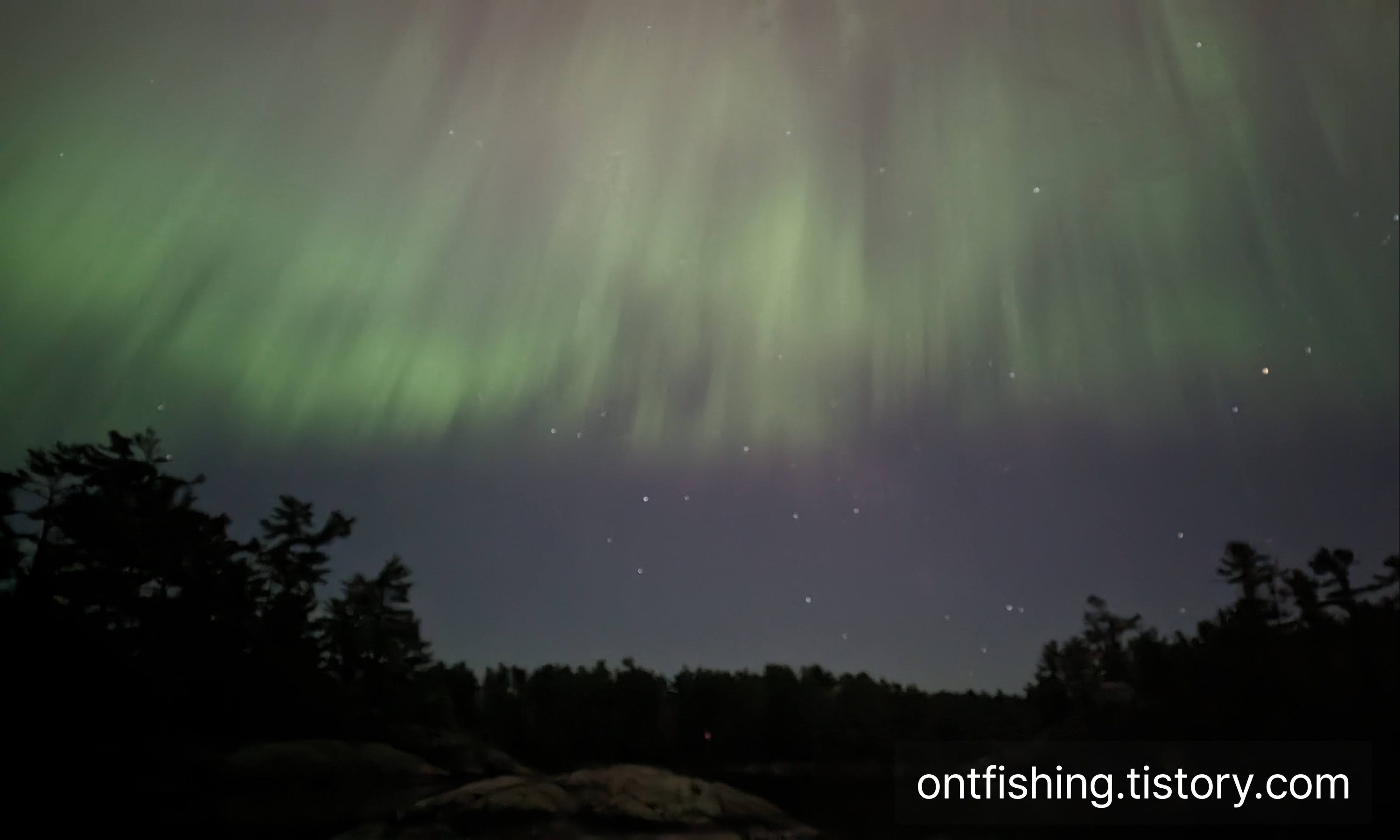 이 날은 왠지 밤낚시가 잘 될것 같은 느낌에 카티지 낚시를 와서 홀로 카누를 타고 밤에 호수로 나왔었다. 오는 길에 라디오 뉴스에서, 2024년은 태양풍의 활동이 활발해 평소 오로라를 볼 수 없는 지역까지 오로라를 볼 수 있을 것이라는 보도가 있었으나, 사실 한쪽 귀로 흘려들었었다.